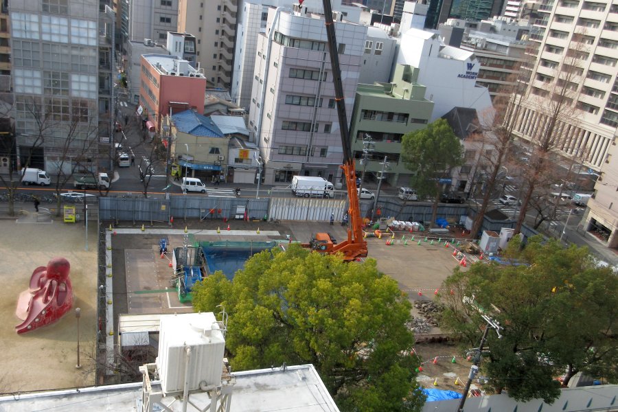 公園の様相、またも変わった。直径20mの穴が四角に囲われ、クレーンが何やら上下させている。