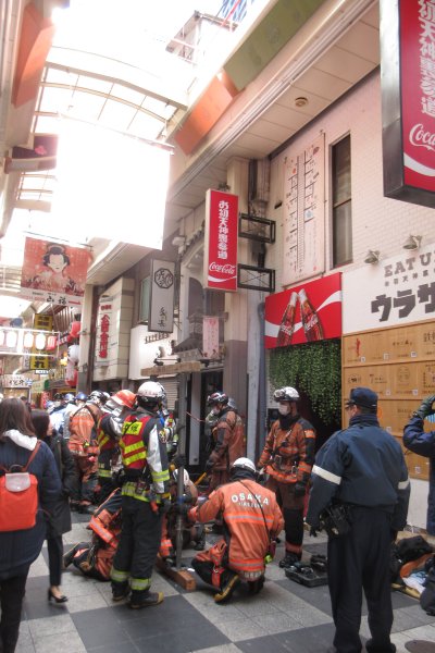 御堂筋にはまだ消防車が3台停まり、お初天神通りで消防隊員諸君が調査中であった。