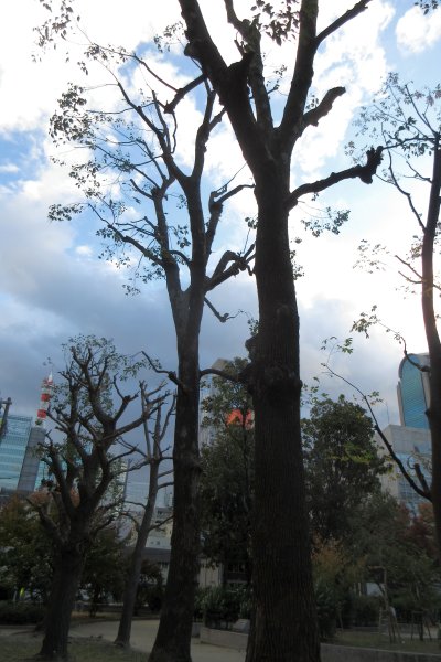 帰路、公園横、いつもとは反対側を通ったら、樹木の枝がバッサリ切り落とされている。