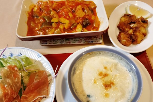 夜は専任料理人が、グラタンや野菜の煮込んだのやらを並べる。