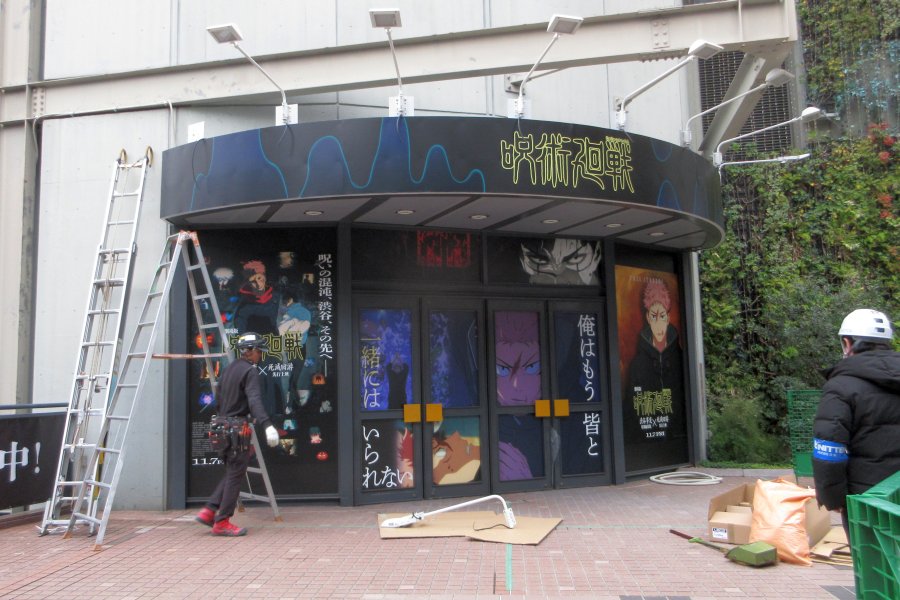 南北2箇所の出入口に「呪術廻戦」の看板が作られ、1階内部で工事中。