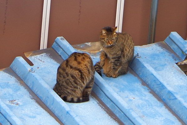 昼、ノラが2匹、市営廃墟の屋根の上に出てきた。