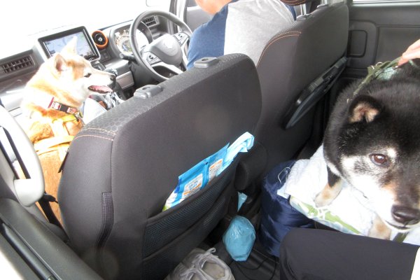 犬の席が前後斜めにあり、人間も前後斜めに乗るという変則的な車内仕様。