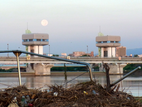 6時前、日の出とともに、毛馬洗堰の向こうに「中秋の満月」が沈む。