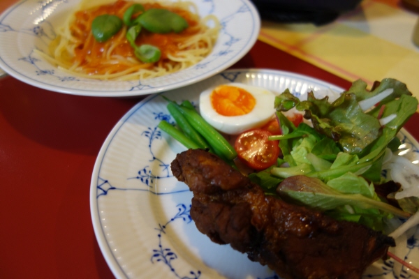 夜はスペアリブ、サラダ、普通のパスタなど。