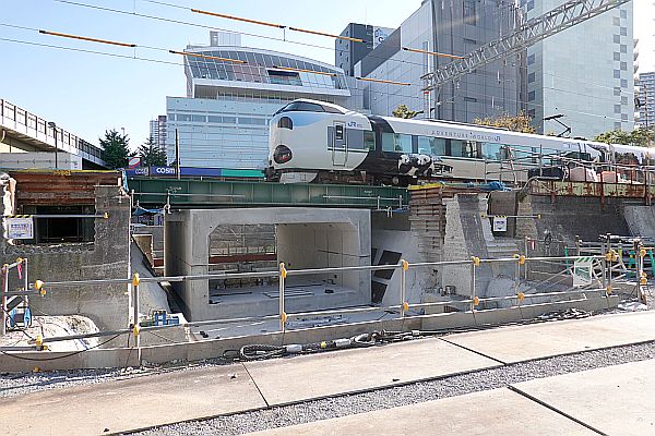 線路が地下から出て旧高架までの区間(中津架道橋を過ぎて地表に出て、豊崎第6架道橋あたりで地表、新御堂の手前で旧高架につながる)は、ほぼ「軌道面」が出来上がり、側壁の工事中である。