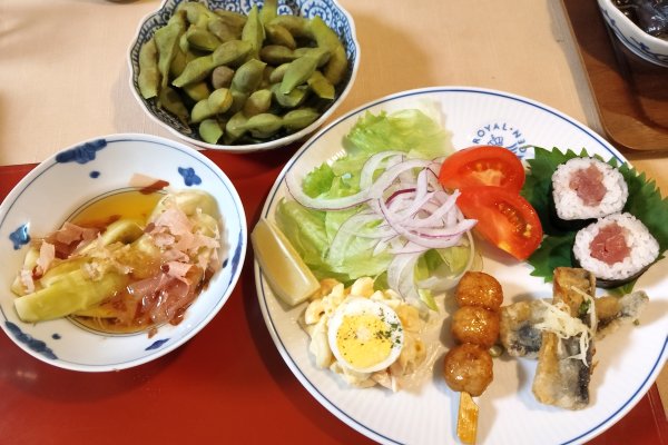 洗い物を減らすため、1パレットに色々盛りつける形式になったが、これがビール飲むには絶好。