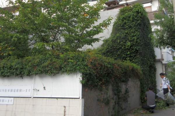 A研究所員らしい数人が繁殖した蔦の剪定中であった。