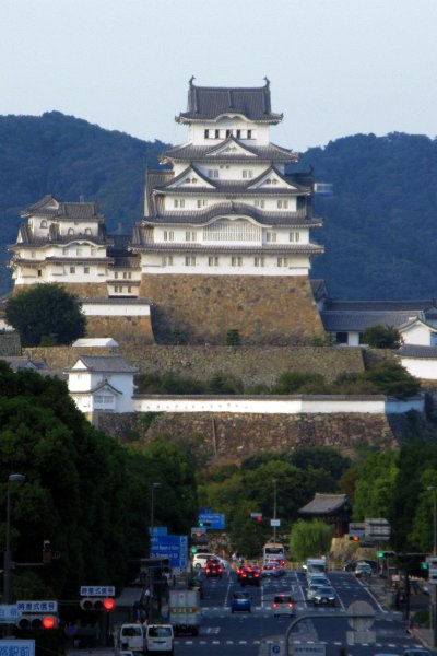 夕刻のキハ系で姫路へ、姫新線ホームから夕暮れの姫路城をちらっと眺める。