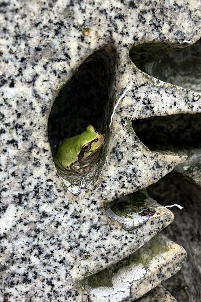 堀家之墓の「家」の字の左端にいる。初代の登場は23年前で、亡母が短歌に詠んでいる。その後も数回登場。同じカエルの一族なのであろうか。
