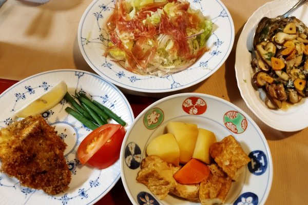 夜は専任料理人が鯵フライとかキノコのガーリックなんたらとかを並べた。