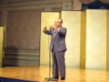 津軽三味線と和太鼓のにぎやかなオープニングであったが、形式的な挨拶と米朝師匠の発声による乾杯のあとは、関西にしては珍しく品のいいパーティであった。